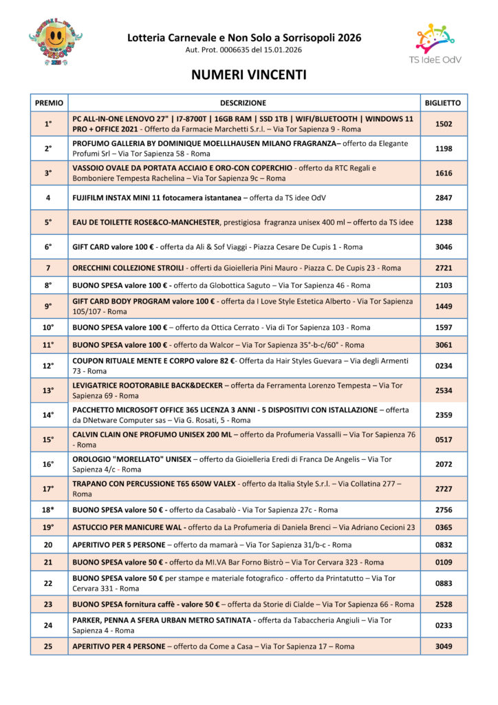 LOTTERIA CARNEVALE E NON SOLO A SORRISOPOLI 2026: NUMERI VINCENTI